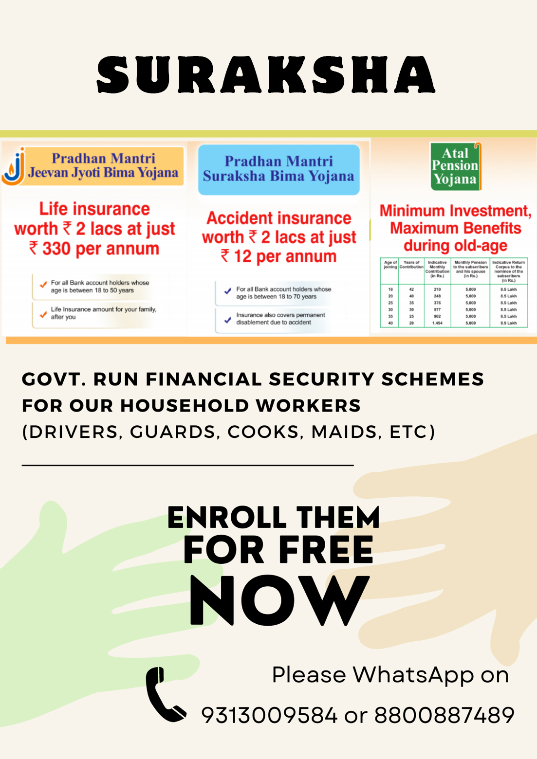 Read MoreProject Suraksha is a social initiative aimed at encouraging labourers and household workers to enrol in government-provided social security schemes for financial security. With the help of Project Suraksha, labourers household workers can easily enrol in the Atal Pension Yojana and PMSBY/PMJJBY/ABPMJAY insurance schemes, empowering labourers, domestic workers and their families financially.